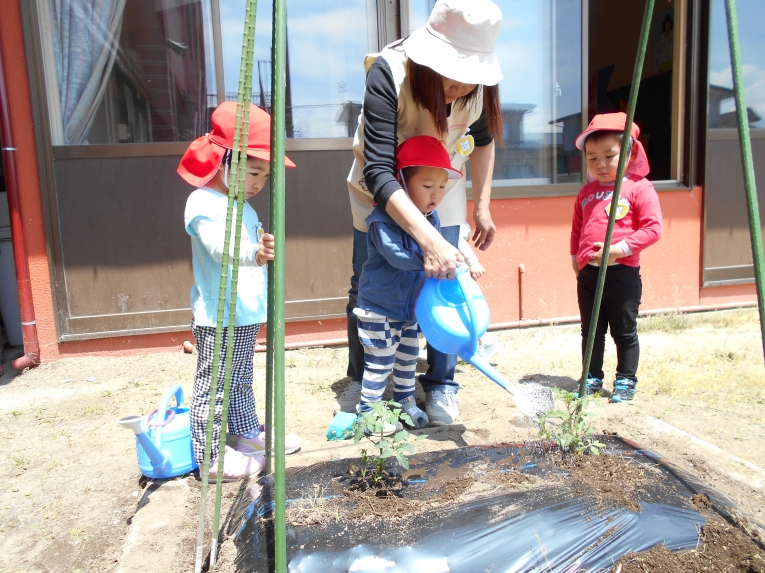 「美味しいトマトができたらいっぱい食べようね!」と言うと、「大きくなあれ」とみんなでおまじないをかけました。早速お水をかけてあげたりと、楽しみに待つひよこちゃんなのであります