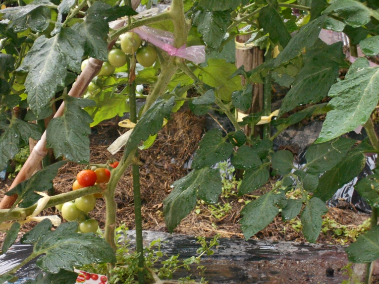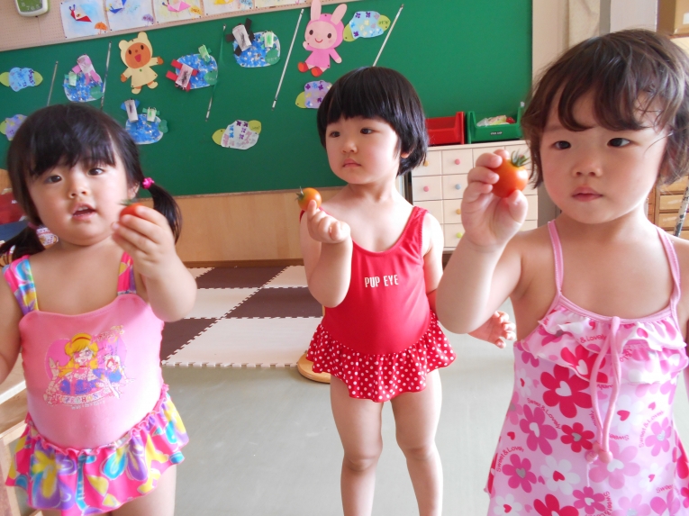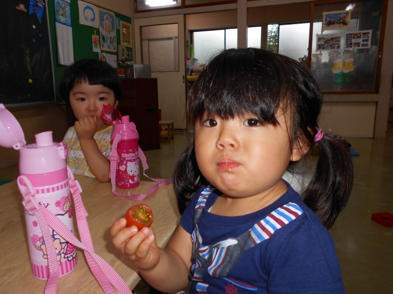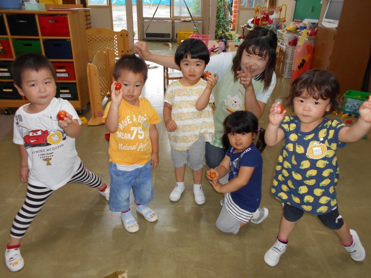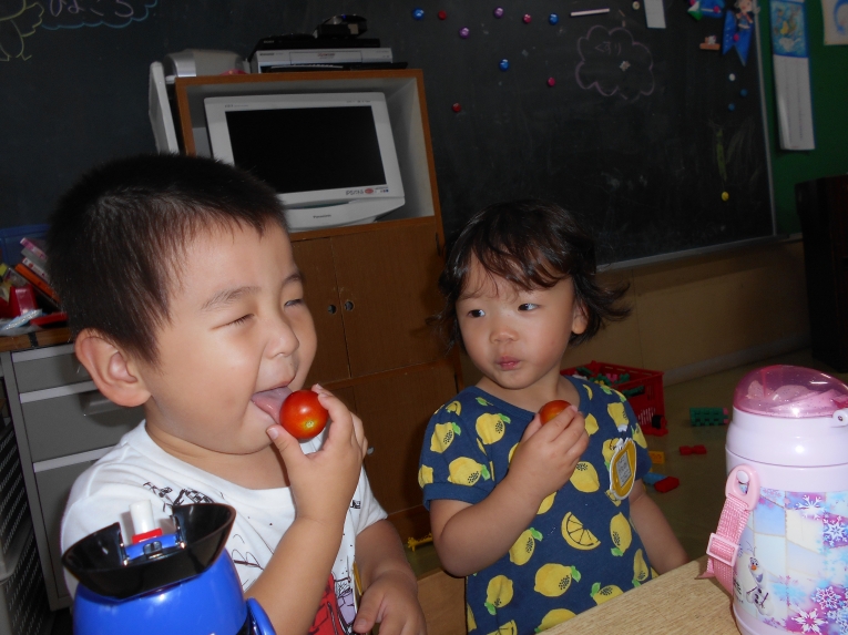 ひよこ組で育てたミニトマトが赤くなりました。とってもあま~い美味しいトマトです