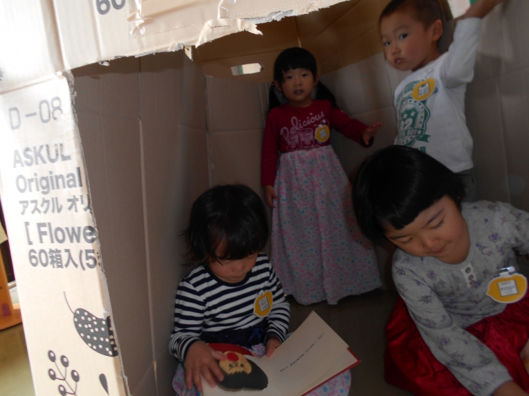 ダンボールで作ったお家の中で・・・