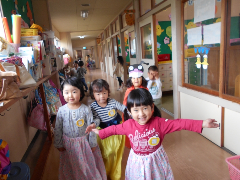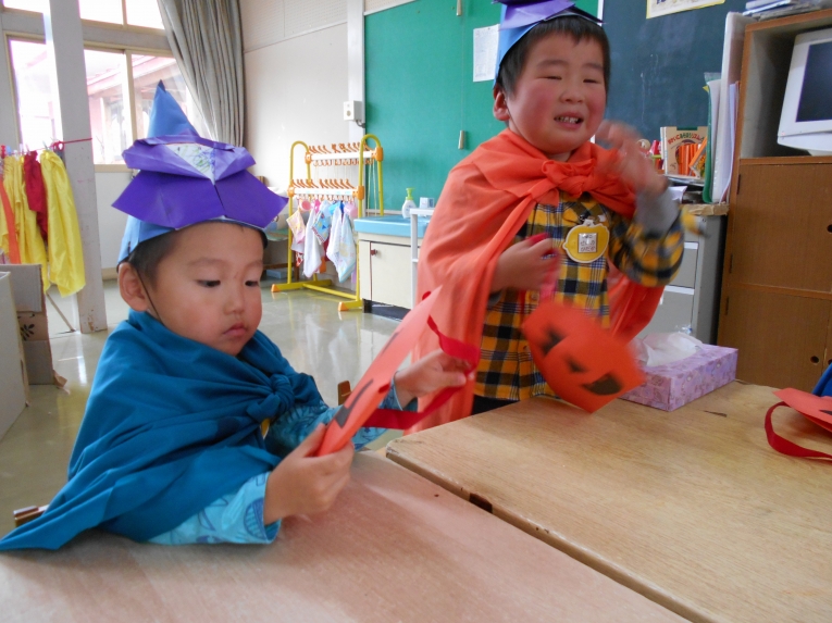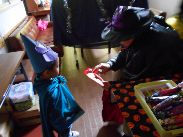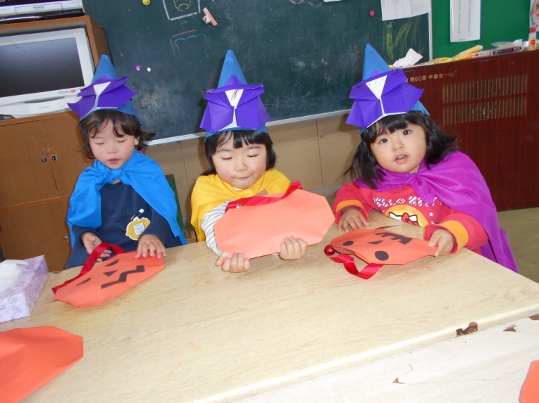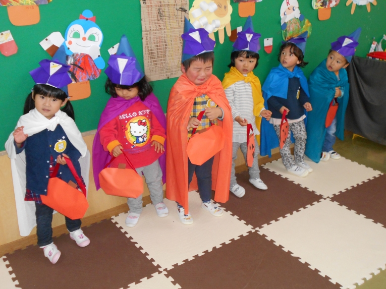 先日はハロウィンが行われ、何だか意味が分からないながらも、わくわくして参加したひよこちゃんたちです手作りの帽子とバックを片手に魔女さんがいるお部屋へ向かいました。「Trick or Treat」がなかなか言えなくて「ト、ト、トイト(@_@)」と言って頑張るひよこちゃんたち!何ともかわいくてかわいくて