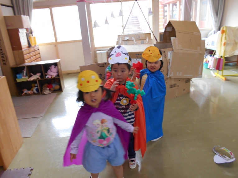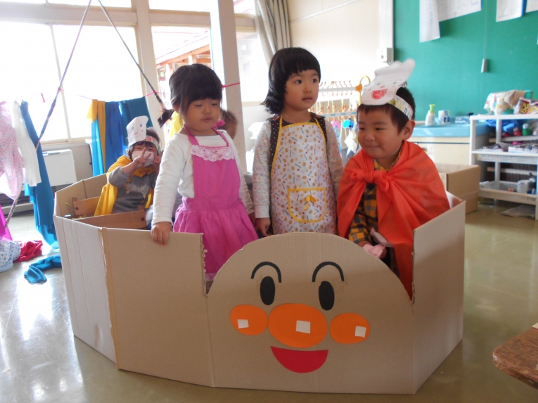 ダンボールをつなげてアンパンマン号を作ったよ