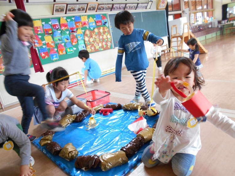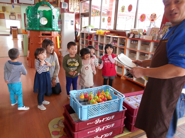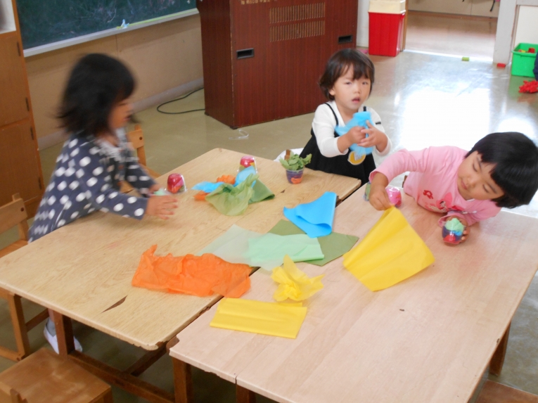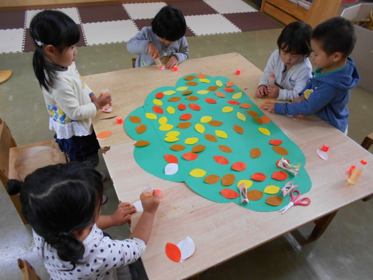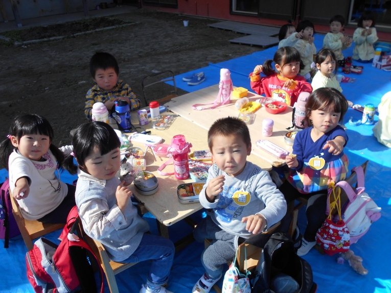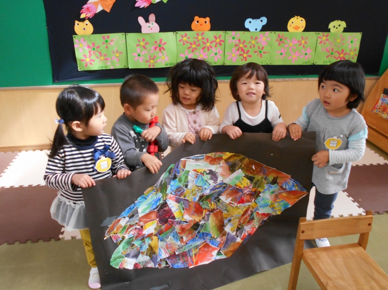 秋が深まり朝晩の冷え込むようになりました。でもひよこちゃんたちは欠席が少なく毎日元気いっぱいです東部文化祭の展示ではひよこちゃんならではのほのぼのした作品が出来上がり、上の学年の子たちとの共同作品に花を添えました。天気の良い日はいっぱいお日様の光を浴びて、元気な体作りをしていきたいと思います。