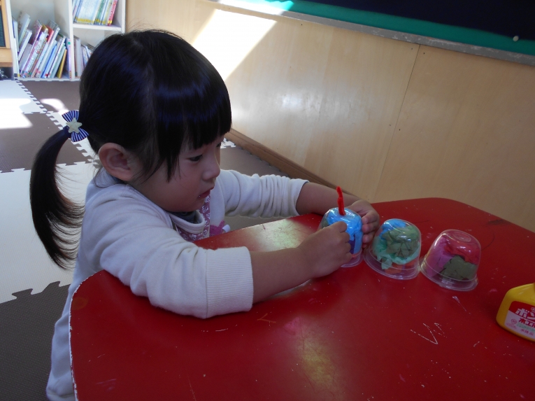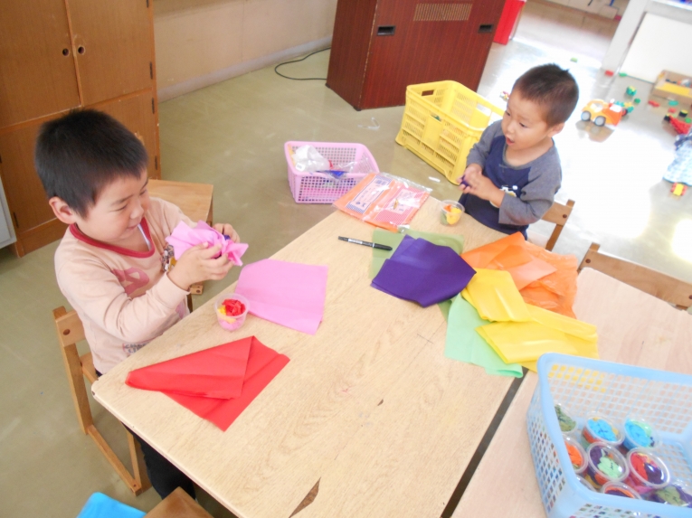 ひよこ組さんでは、勤労感謝の日にちなんで、給食屋さんと牛乳屋さんにプレゼントとメダルをお渡ししますそのプレゼント作りの様子です