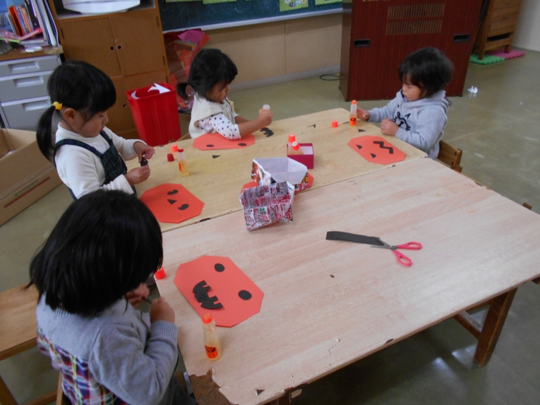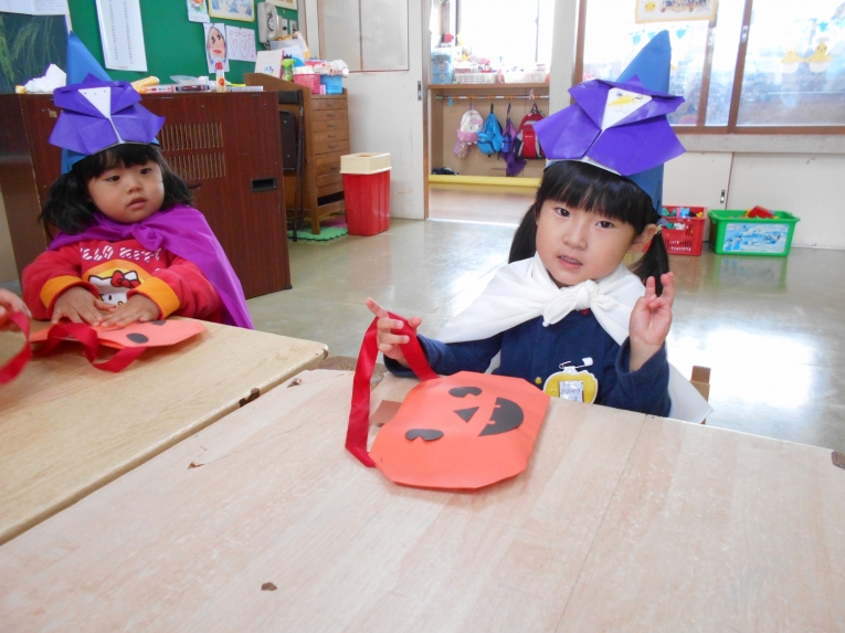 今日はハロウィン♪先週、かぼちゃのおやつバッグを作ってから、おやつがもらえる日を今か今かと待っていたひよこ組さん