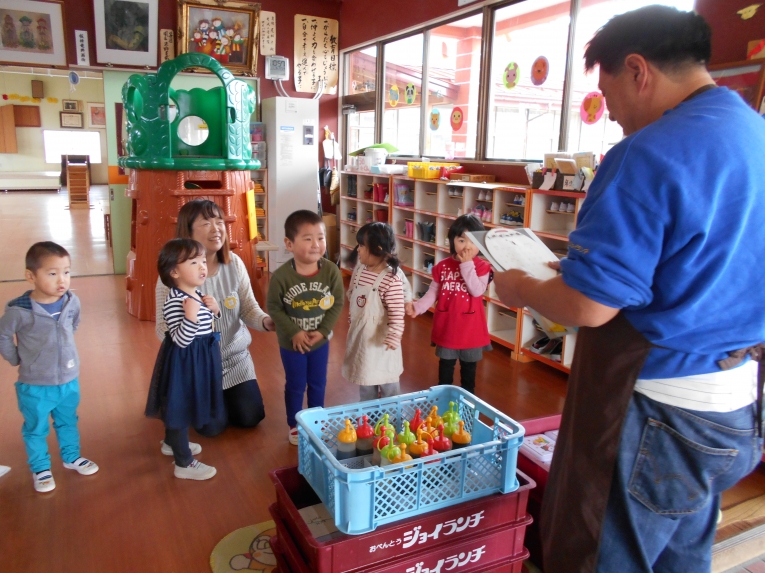 11月は七五三と勤労感謝の日に向けて、作品作りを頑張りました。頑張って作った七五三の袋に美味しい千歳あめを入れてもらってご機嫌のひよこちゃんでした