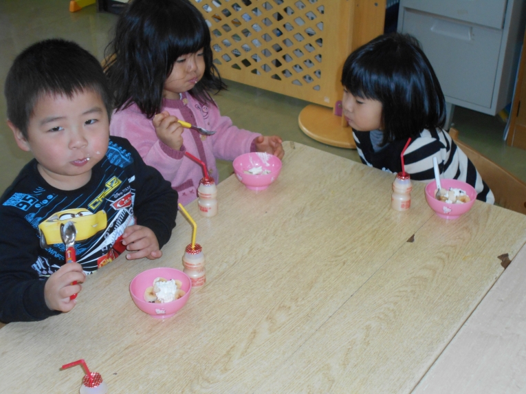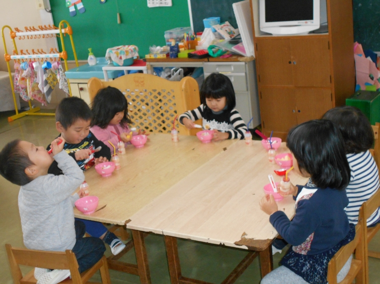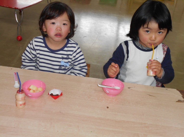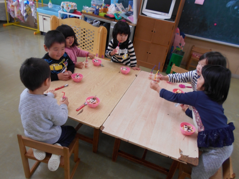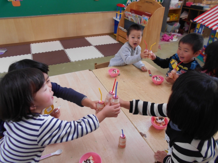 二学期修了のささやかなおやつパーティーをしましたみんなよくがんばりました~「カンパーイ」