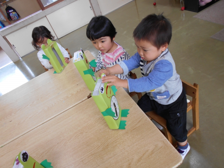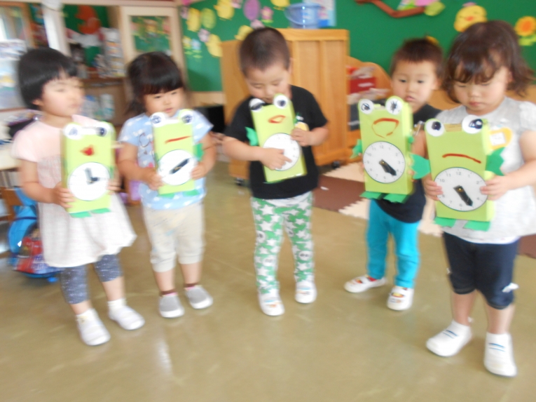 保育室の前にはミニひまわりの種も植え、きれいな花が咲くのを楽しみにしています。また、時の記念日にむけカエルの時計作り、絵の具あそび、折り紙など製作面でも頑張って取り組んだ一週間でした
