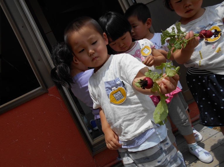 二十日大根を収穫し、きゅうりと混ぜて漬物にしたら「おいいしい!」の声!たくさん食べてくれました